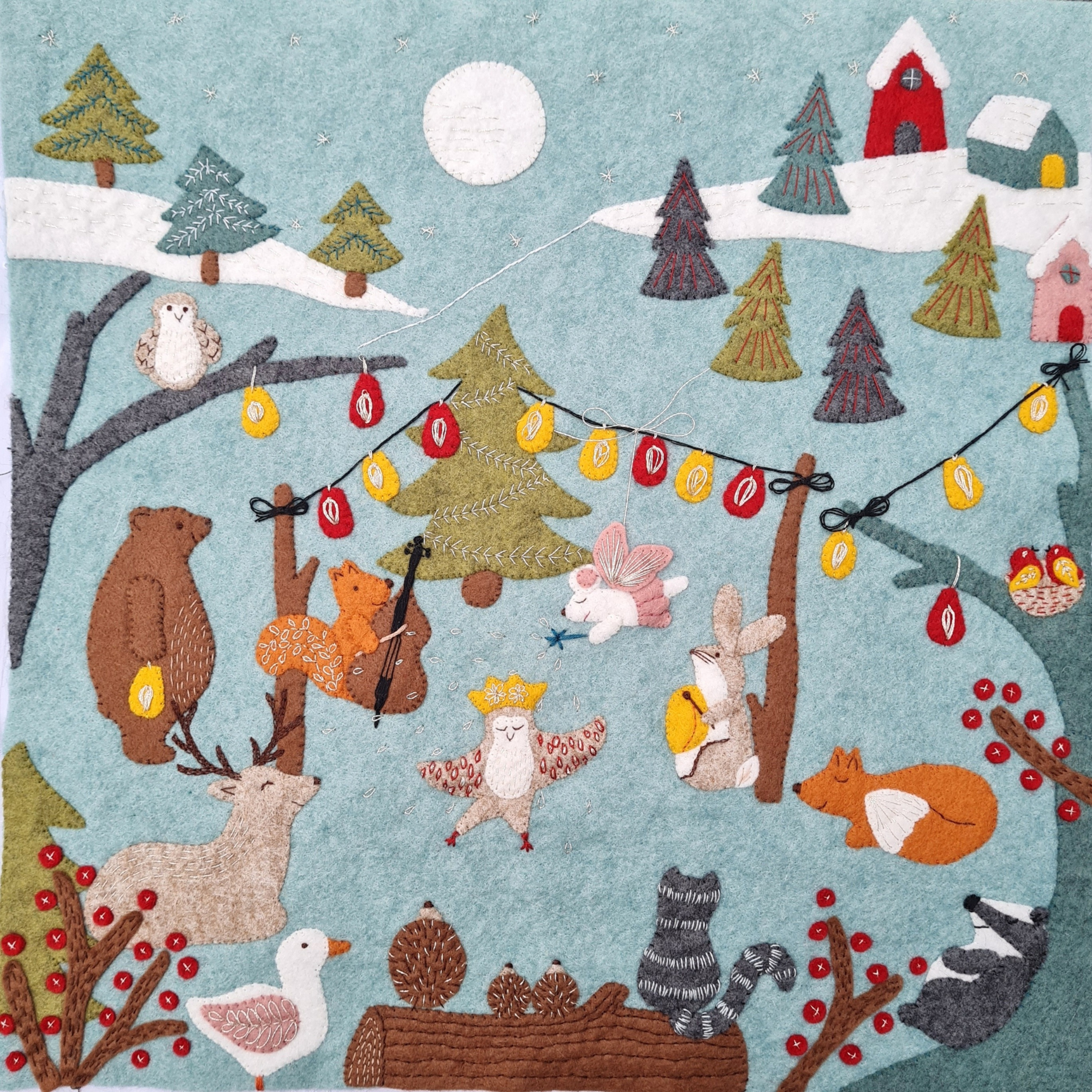 This year, Corinne has been inspired by her beloved woodland creatures and what secret fun they might be up to in the days before Christmas. As ever, Corinne has chosen the richest shades of felt and designed charming patterns to bring this picture to life.